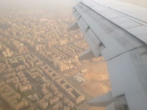 Wow, wie riesig Kairo ist, aus dem Flugzeugfenster erkenne ich Blocks wie nebeneinander aus dem Boden geschoben, ohne Luftspalt, ein Gitter aus braun staubigen Ziegeln, die Häuser mit kaum einem Luftspalt aneinander gebaut, riesige staubige Wohnquadrate. Mutige Felder schlagen Breschen in die Wüste, andere Felder wieder staubig, wirken wie weggeworfen.